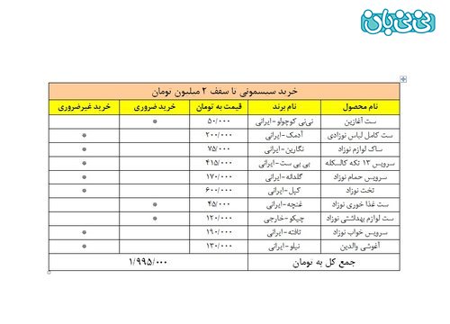 بر اساس تحقیقات میدانی که ما به جای شما از بازار سیسمونی نوزادان انجام داده‌ایم، هزینه‌های ضروری یک ست سیسمونی مبلغی حدود ۲میلیون تومان خواهد بود.