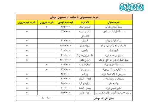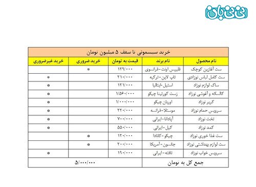 این جداول با سقف هزینه؛ تا دومیلیون تومان، تا پنج میلیون تومان، تا ده میلیون تومان تنظیم شده‌اند که بسته به نوع انتخاب شما برندهای متفاوت و محصولات مختلفی در آن گنجانده شده است.